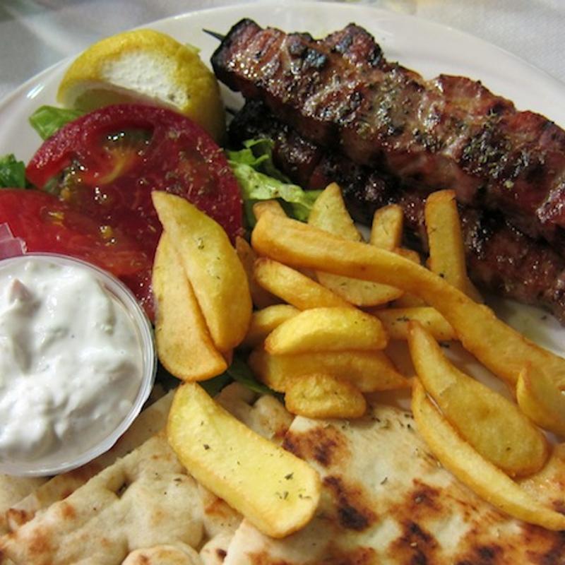 Your choice of meat: chicken, pork, bifteki, or gyro (served with a pita, tomatoes, red onions, fries and tzatziki).