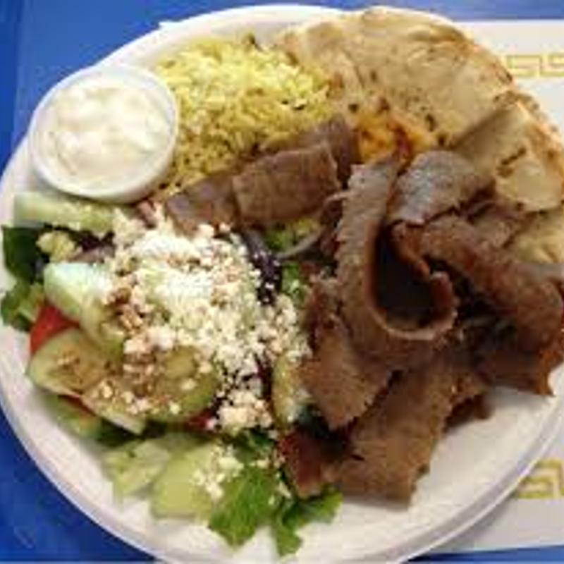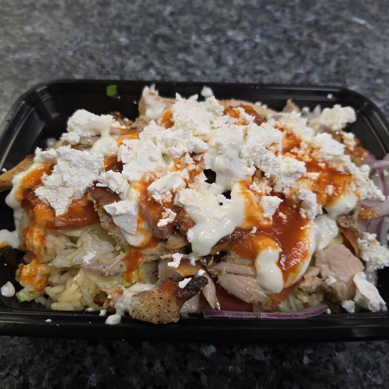 Your choice of Gyro meat ,Falafel, or Any skewer over a bed of rice,lettuce ,tomato, and onions, topped with tzatziki,our homemade hot sauce and feta cheese