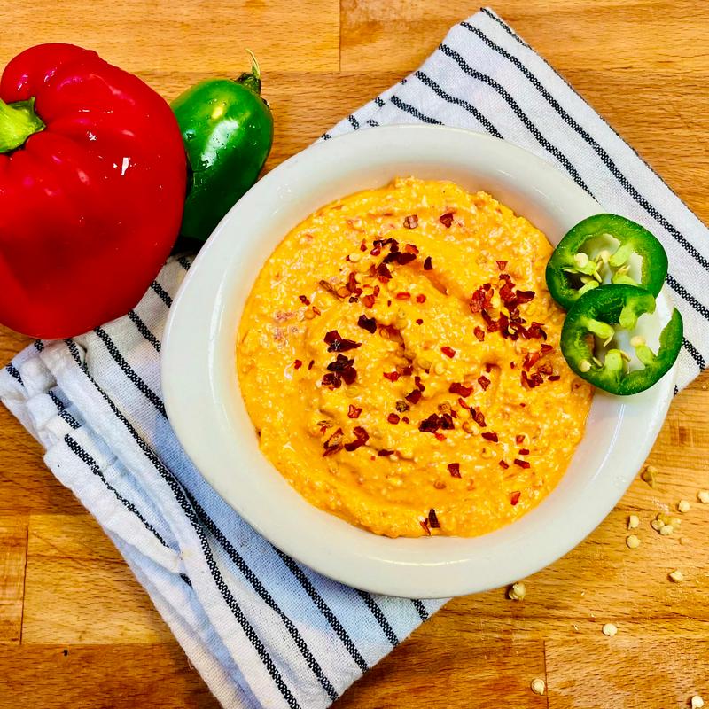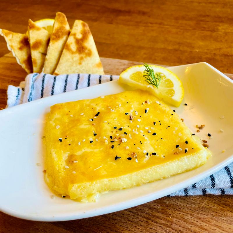 Feta cheese, roasted hot red peppers, garlic and spices blended together to create a delicious balance between spicy and tangy; served with two pites.