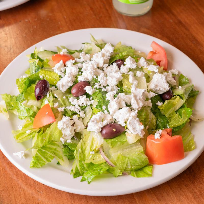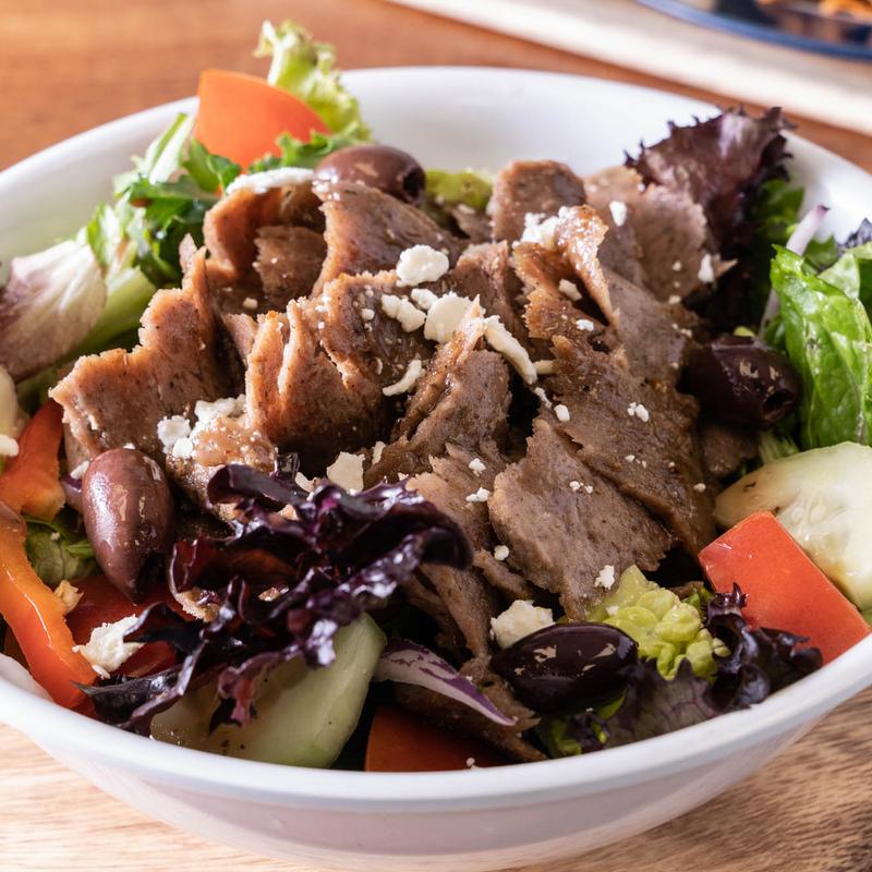 Hearts of romaine lettuce. Roma tomatoes, cucumbers, red onions, Kalamata olives, feta tossed with our special dressing and your choice of gyro meat, pork, chicken, or lamb/beef.