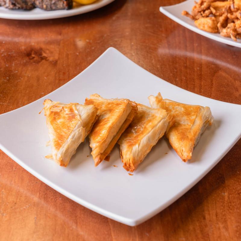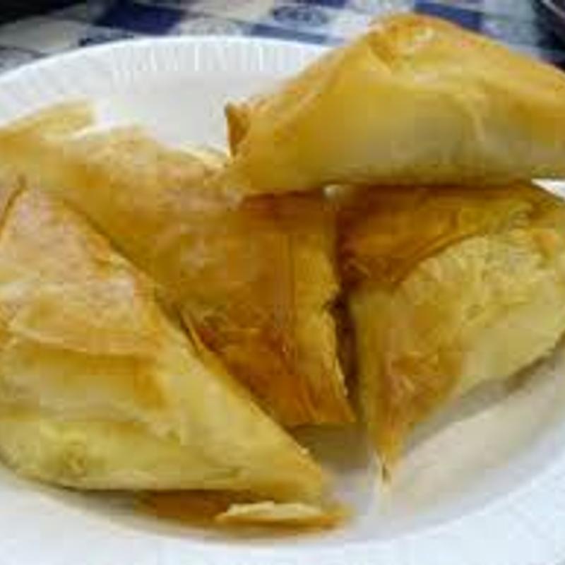 A Greek layered savory pastry, made of layers of buttered phyllo and packed with a warm cheese-egg filling.