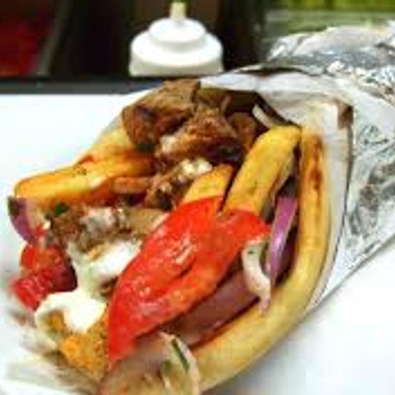 This flame-grilled seasoned beef sandwich is wrapped in a handmade pita with tomatoes, onions, a few fries and tzatziki.