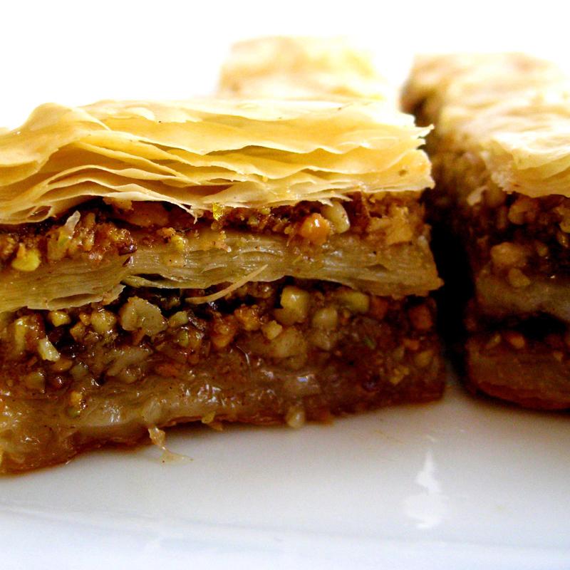 Baked layers of phyllo with walnuts, and sweetened with cinnamon, cloves and syrup.