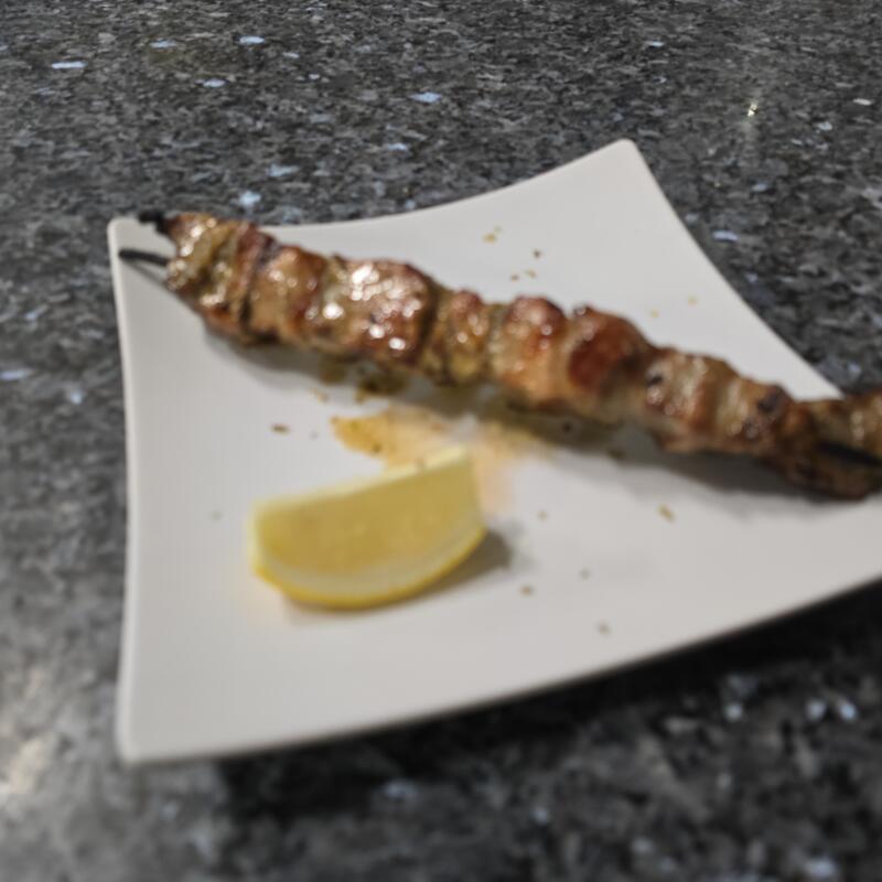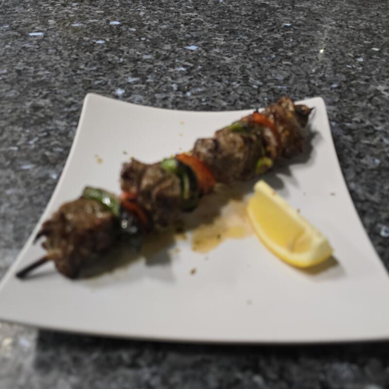 Your choice of meat: 2 lamb skewers or 2 beef skewers (served with a pita, tomatoes, red onions, fries and tzatziki).