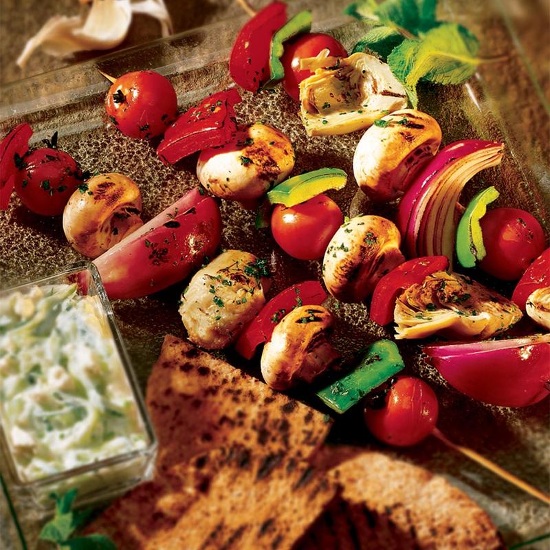 Get fired up vegetarian-style! This great-tasting Mediterranean souvlaki will satisfy all appetites. This souvlaki skewer is made up of grilled mushrooms, red and green bell peppers, zucchini and served with tomatoes, lettuce, red onions, feta and tzatziki sauce wrapped in handmade pita bread.