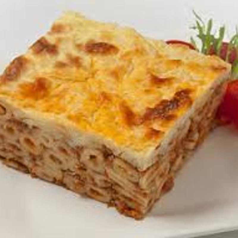 This is the signature Mediterranean pasta dish; layered pasta and ground beef topped with a cheese-béchamel sauce.
