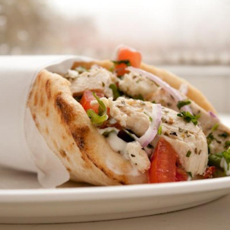 Gyro chicken served with tomatoes, red onions, shredded lettuce, a few fries and tzatziki wrapped in pita.