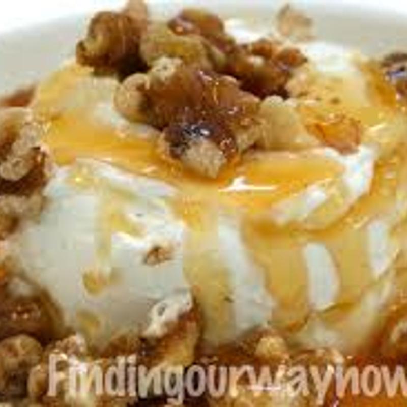Traditional Greek Dessert with yogurt topped with honey and walnuts
