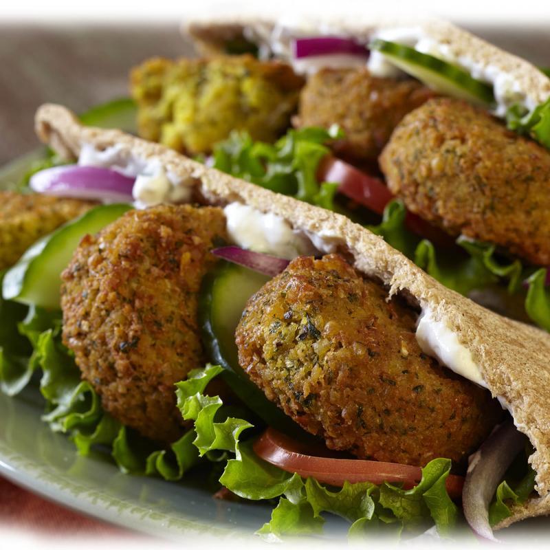 Get fired up vegetarian-style! This great-tasting Mediterranean souvlaki alternative will satisfy all appetites. This Falafel ball souvlaki is served with tomatoes, lettuce, onions, cucumbers and tzatziki sauce wrapped in handmade pita bread.